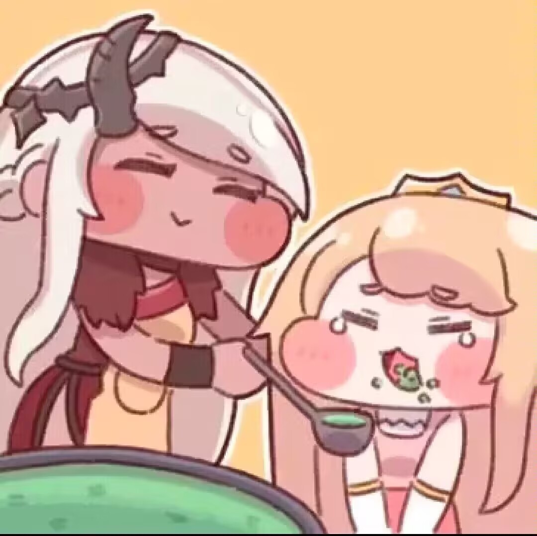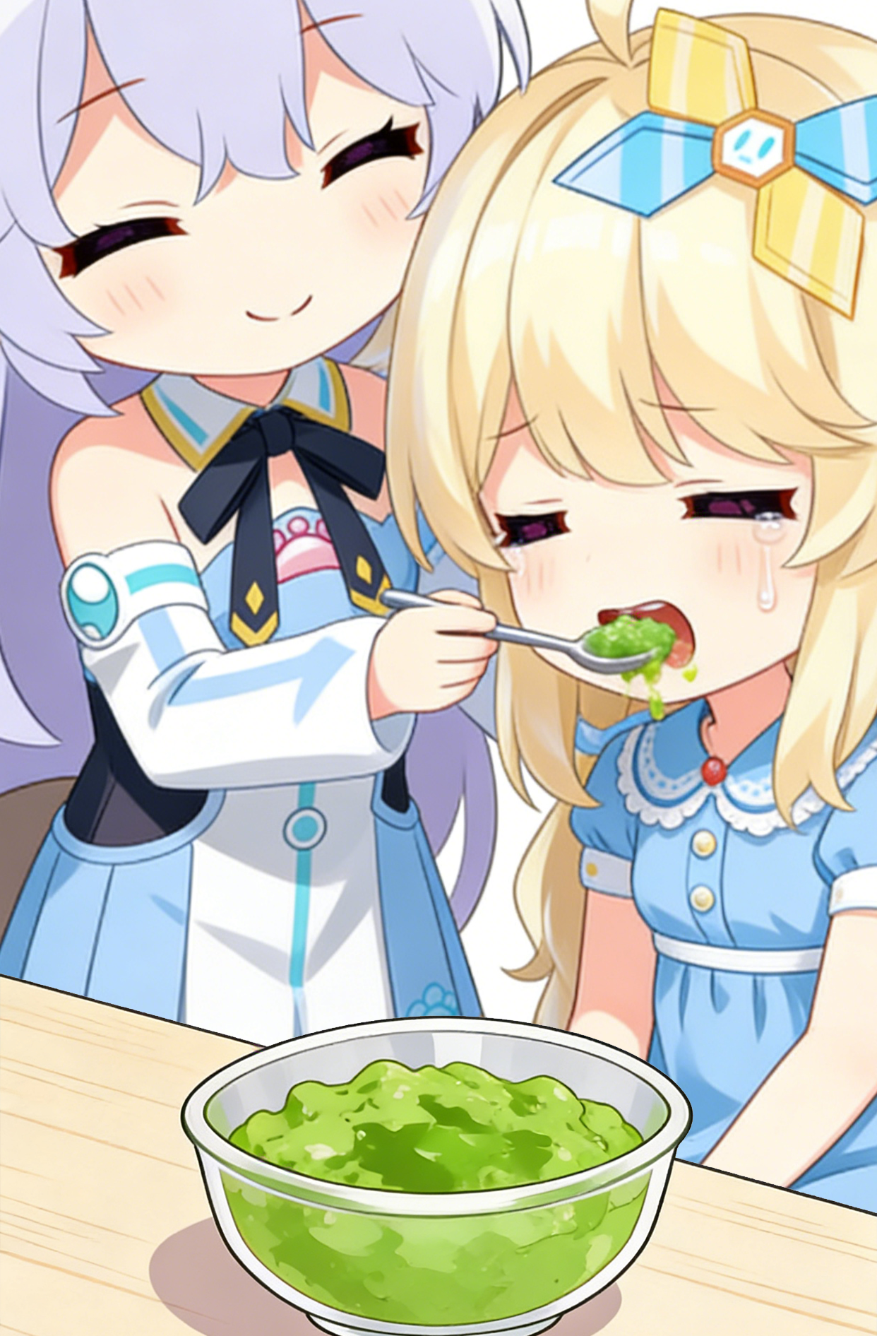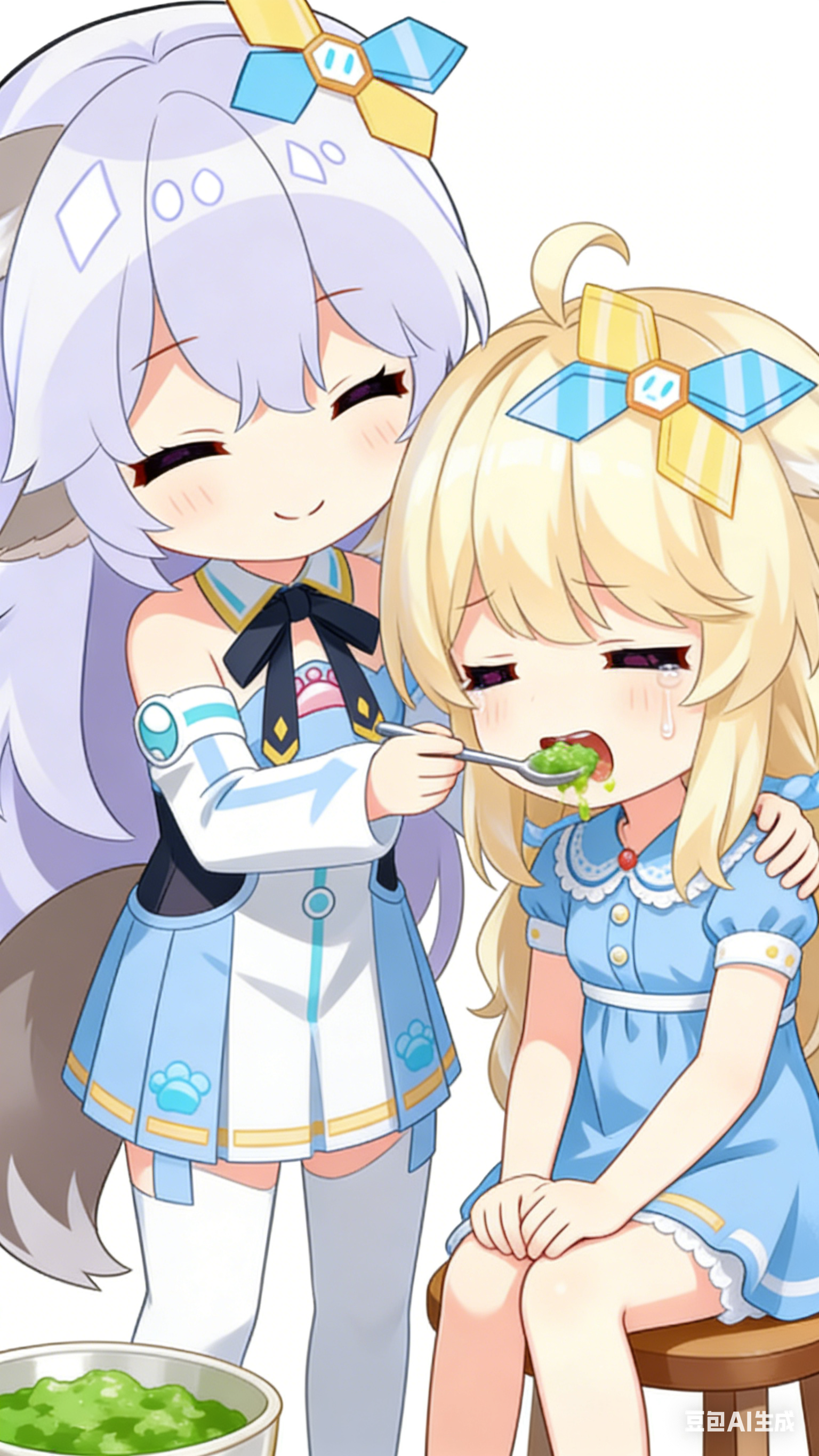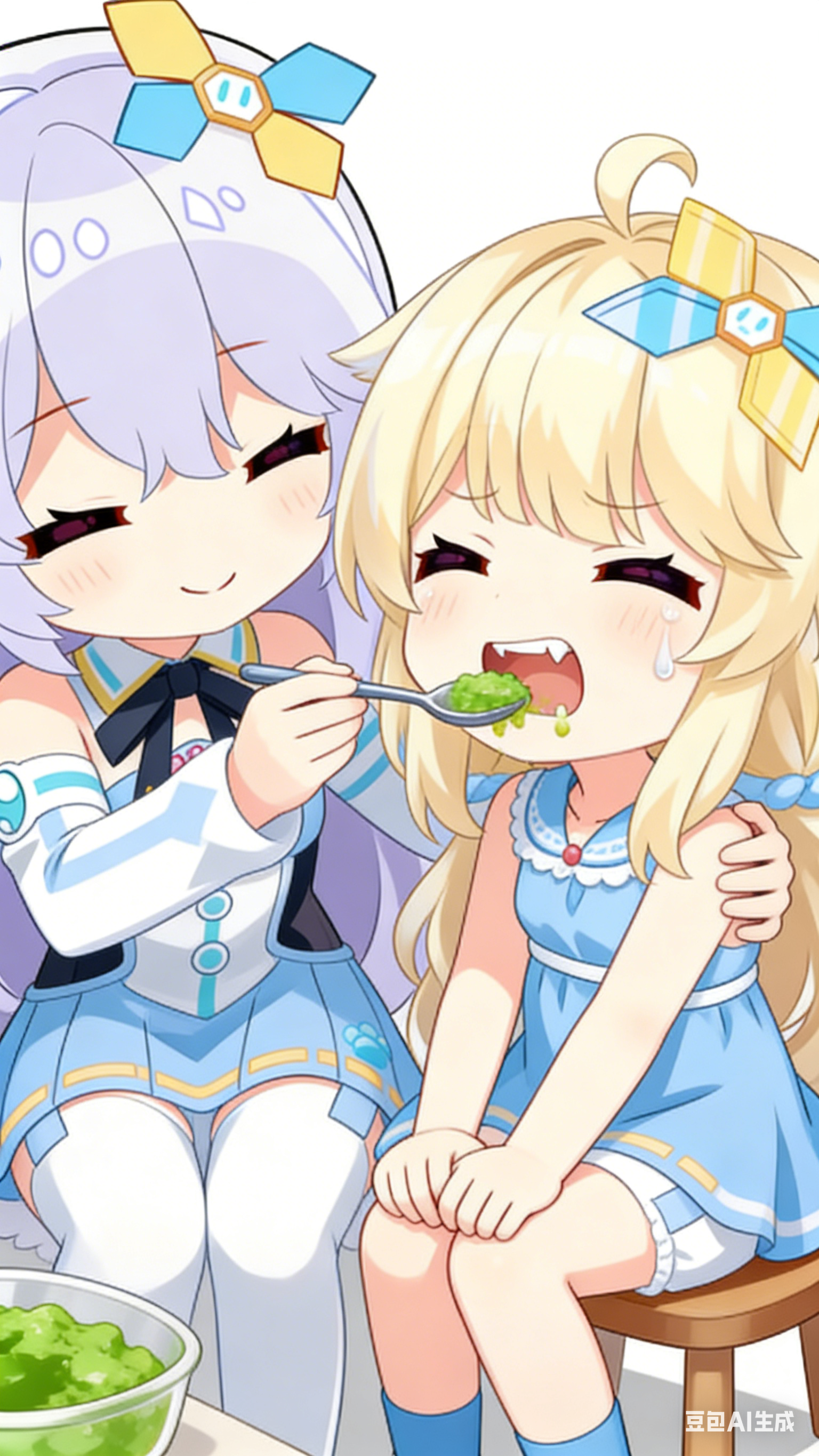 生成图片。 这张图片是近景特写镜头,聚焦于两个 Q 版卡通人物的互动,画面紧凑且突出角色表情与动作: 左侧人物(图1人物):身体微微前倾,是眯眯眼,脸上带着温柔慈祥的笑意,正用勺子舀起食物,递向右侧人物的嘴边,动作是主动投喂的状态,左侧人物另一只手扶着右侧人物的背,注意是扶背,画面上看不见扶背的那只手。 右侧人物(图2人物):比左侧人物低一个头,看起来年纪比左侧人物小很多,嘴巴被迫张开,嘴里还含着没咽下的食物(嘴角沾着残渣),脸上满是抗拒 / 为难的表情(悲伤的眉头、眯眯眼、眼角有泪珠),坐着凳子上,双手不知所措地叠在膝盖上,身体看起来有点僵硬,呈现出 “被投喂到哭” 的反应。 画面左下方能看到一锅装着绿色食物的容器,进一步强化了 “喂食” 的场景感,整体氛围既可爱又带点搞笑的反差感~ 画面比例1:2