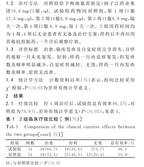 对照组使用地氯雷他定进行治疗;观察组在对照组基础上加用复方甘草酸苷进行治疗